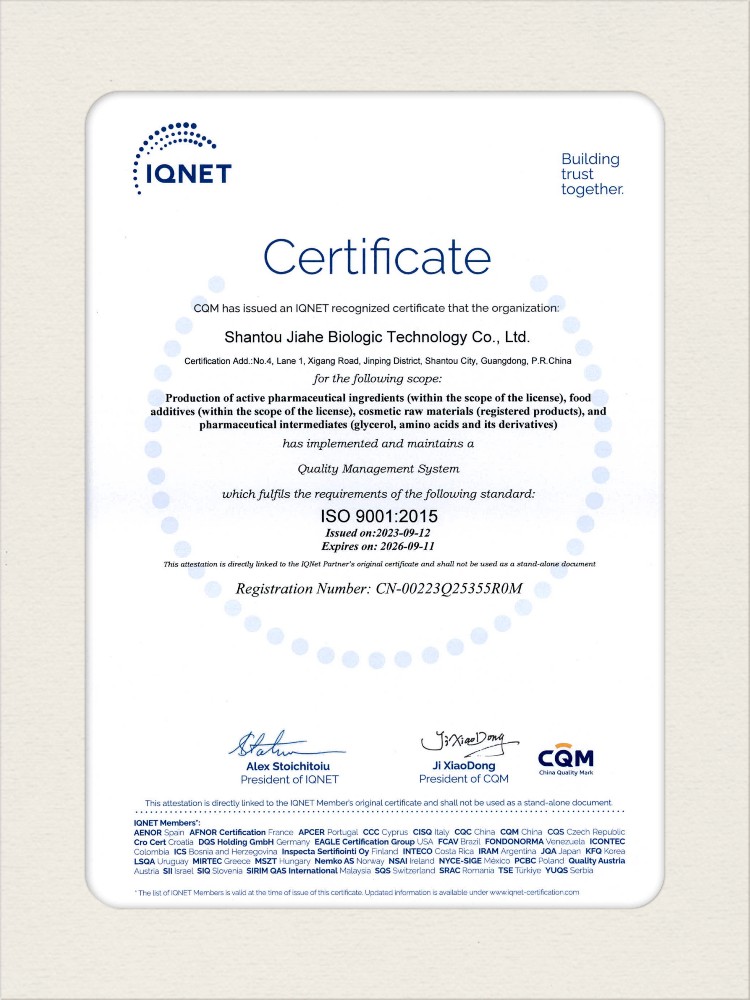 汕頭佳禾生物科技有限公司是一家致力于氨基酸及其衍生物研發(fā)、生產和銷售的國家高新技術企業(yè),先后通過了國家藥品GMP認證,ISO9001質量體系認證、ISO14001環(huán)境管理體系認證。目前,公司擁有“廣東省專精特新中小企業(yè)”、“廣東省氨基酸產品工程技術研究中心”、“汕頭市生物發(fā)酵工程技術研究開發(fā)中心”、“汕頭市知識產權優(yōu)勢企業(yè)”、“多項國家發(fā)明專利”、“廣東省守合同重信用企業(yè)”等多項資質和榮譽,旗下“佳禾牌”系列產品已成為原料藥行業(yè)知名品牌。 新泰市佳禾生物科技有限公司成立于2012年8月,注冊資金2億元,公司位于山東泰安新泰市新汶工業(yè)園區(qū),是國 家級高新技術企業(yè)、山東省“專精特新”企業(yè)、山東省制造業(yè)單項冠軍企業(yè)、泰安市科技型中小企業(yè)、泰安市農業(yè)產業(yè)化龍頭企業(yè)、中國生物發(fā)酵產業(yè)協(xié)會理事單位。